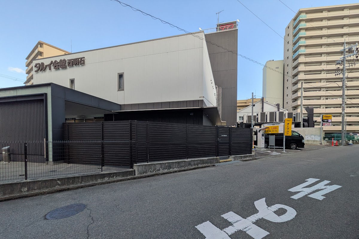 株式会社タルイの葬儀専用式場「タルイ会館 西明石」の東隣になります。台数は少いですが、駅からの距離の割に駐車後12時間の最大料金が1,000円と利用しやすい価格となっています