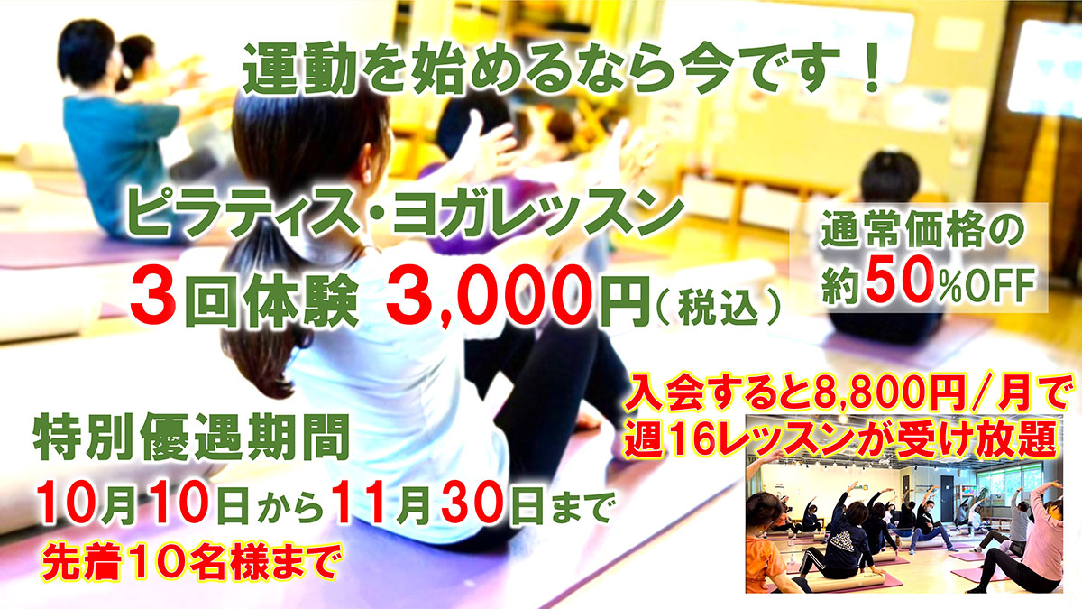 スタジオレッスンは通常1,980円✕3回で5,960円ですが、キャンペーン中は3回で3,000円(税込)となっています!