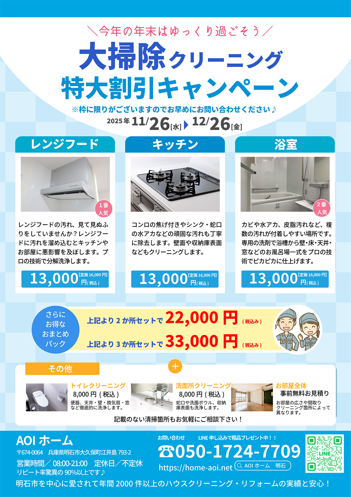 大久保町江井島にあるハウスクリーニング・リフォーム会社の「AOIホーム」で「大掃除クリーニング特大割引キャンペーン」が2025年12月26日(金)まで実施されています!
