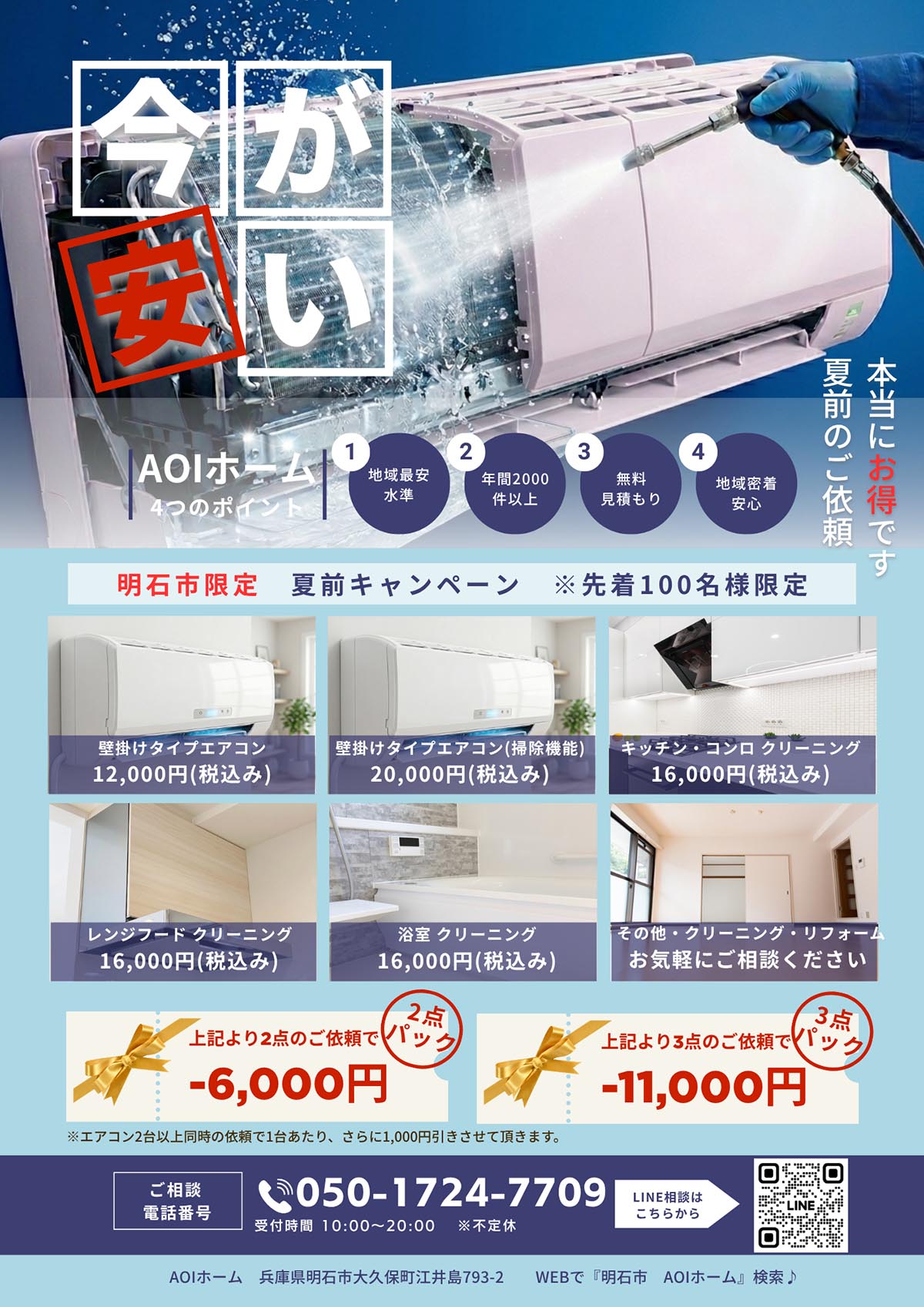 大久保町江井島にあるハウスクリーニング・リフォーム会社の「AOIホーム」で、明石市限定の「夏前のクリーニングキャンペーン」が先着100名限定で実施されています!