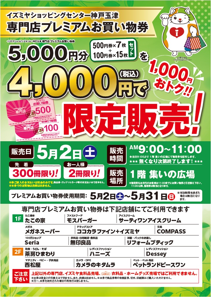 神戸市西区にある「イズミヤショッピングセンター西神戸」や「イズミヤショッピングセンター神戸玉津」で「専門店プレミアムお買い物券」が2026年5月2日(土)限定で販売されるそうです!