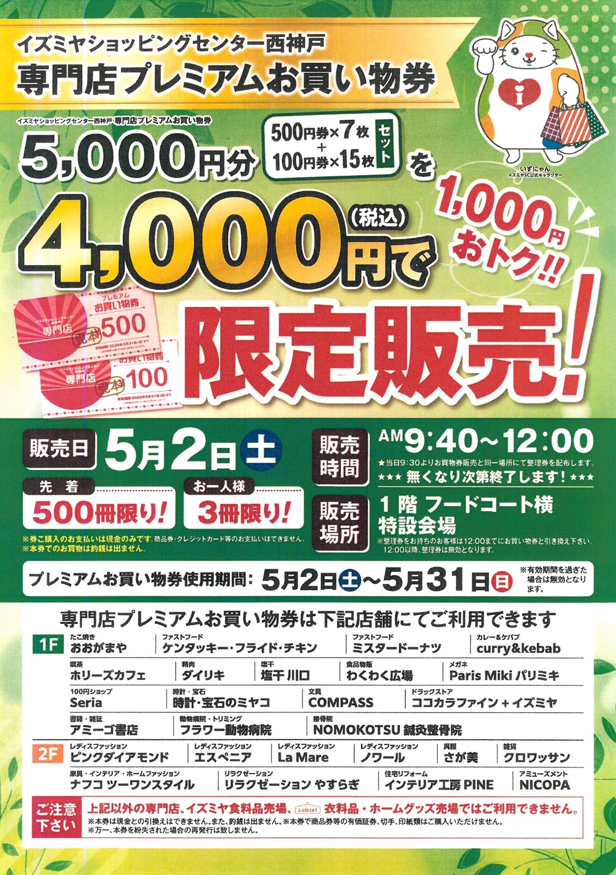 神戸市西区にある「イズミヤショッピングセンター西神戸」や「イズミヤショッピングセンター神戸玉津」で「専門店プレミアムお買い物券」が2026年5月2日(土)限定で販売されるそうです!