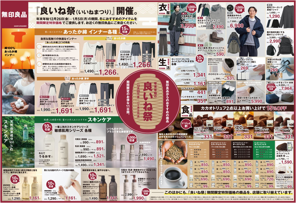 無印良品の季節のおすすめ商品を特別価格で販売するキャンペーン「良いね祭(いいねまつり)」が2025年12月26日(金)~2026年1月5日(月)の期間開催されます!