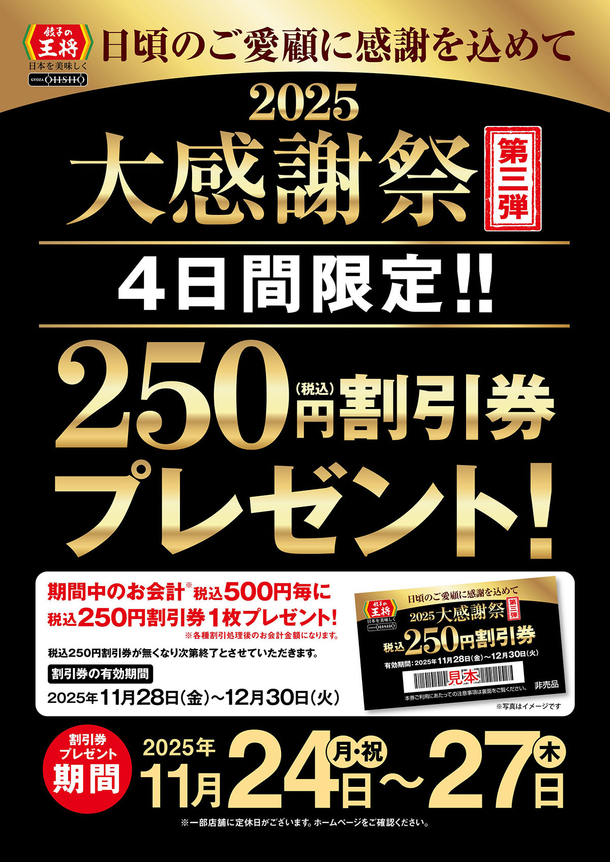 全国の餃子の王将で、各種割引処理後の会計金額税込500円毎に「税込250円割引券」が1枚もらえる大感謝祭 第三弾が開催されます!