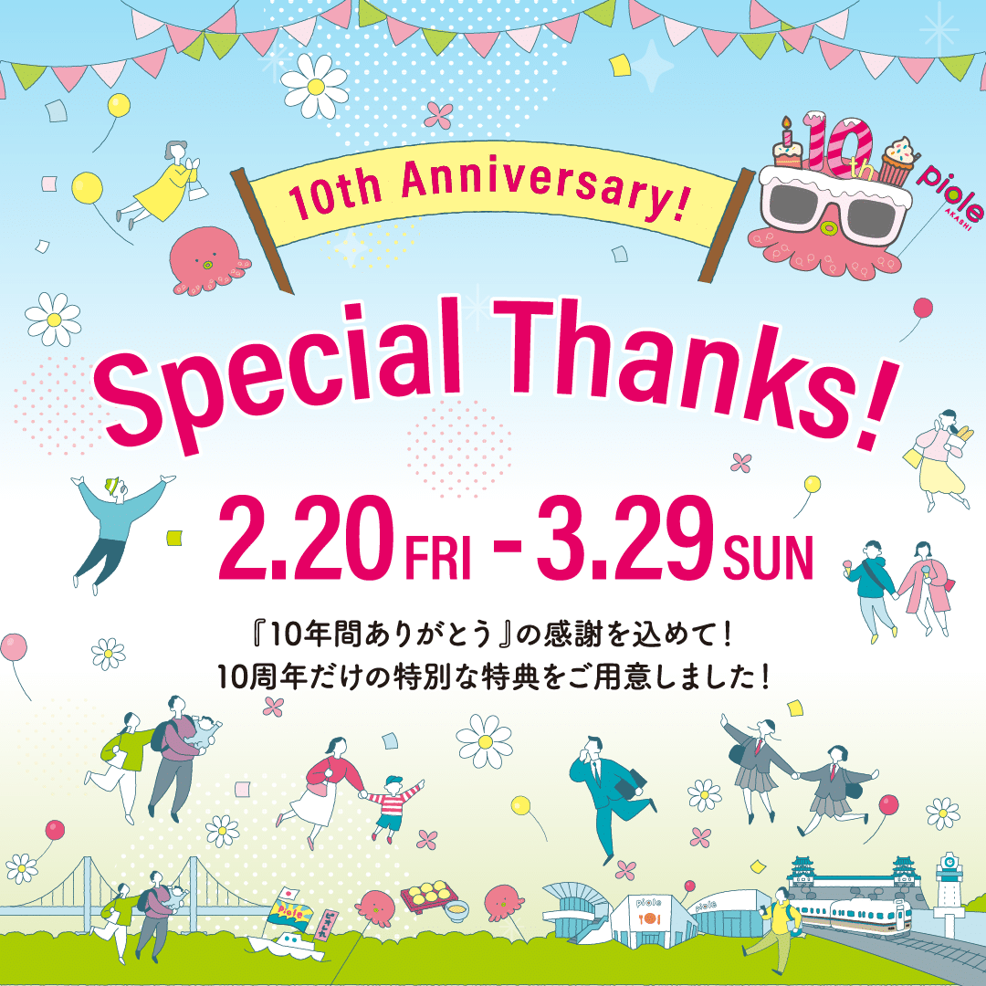 JR明石駅隣接の商業施設「ピオレ明石」で、10周年を祝う特別なキャンペーン「アニバーサリーセール」が2026年2月20日(金)~3月29日(日)に開催されます!