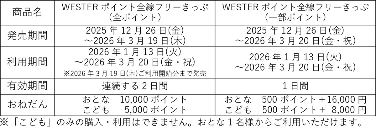 WESTER ポイントを使ってJR西日本全線乗り放題の「WESTERポイント全線フリーきっぷ」が2種類発売!利用期間は2026年1月13日~3月20日