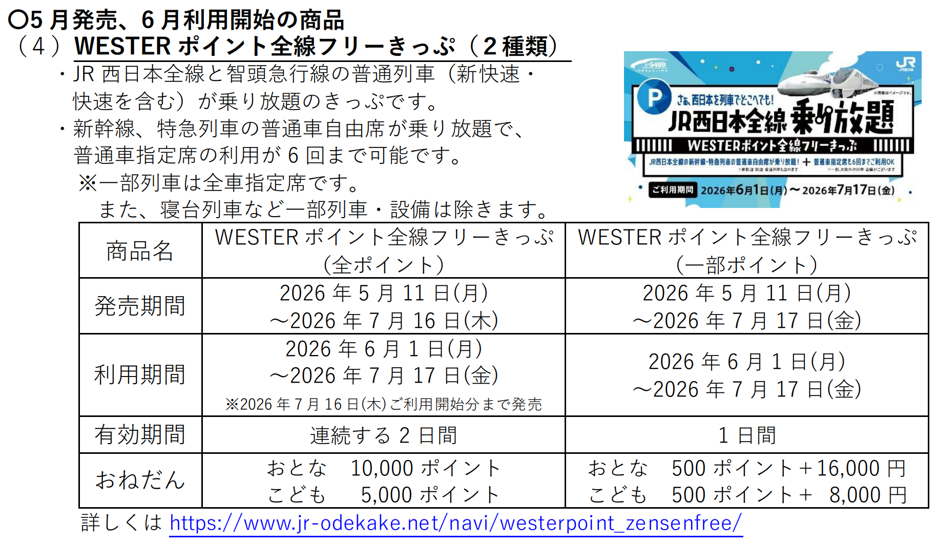 2026年5月11日(月)から発売で、利用期間は2026年6月1日(月)~7月17日(金)となっています。WESTERポイントは貯めておくとお得に新幹線に乗れたりするので、貯められるときに貯めておきたいですね!