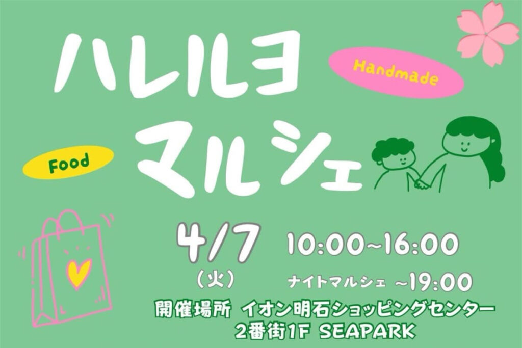 ハレルヨマルシェ JR大久保駅南側にある商業施設「イオン明石ショッピングセンター」2番街1階のSEAPARKで「ハレルヨマルシェ」が2026年4月7日(火)に開催されます! ハ... -