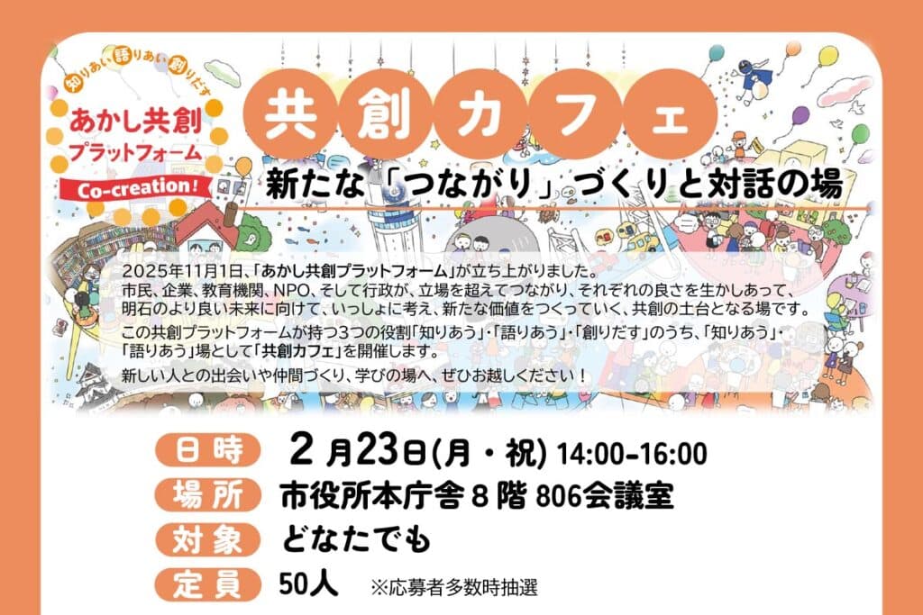 あかし共創カフェ 明石市役所の本庁舎8階の802会議室で、まちの新しい繋がりを創るイベント「あかし共創カフェ」が2026年2月23日(月・祝)に開催されます! このイベン... -