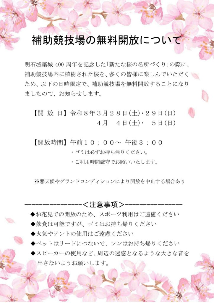明石駅前にある兵庫県立の都市公園で日本さくら名所100選に選ばれている「明石公園」内の「補助競技場」が花見時期に日時限定で無料開放されるそうです!