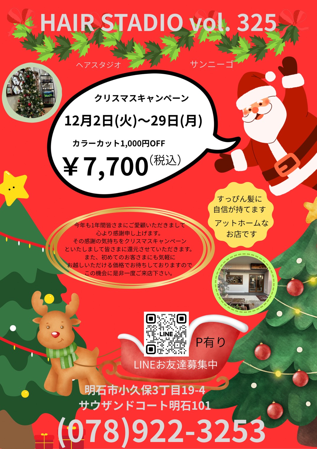 小久保3丁目にある「サウザンドコート明石」1階の「HAIR STUDIO vol.325(ヘアースタジオ サンニーゴ)」で、2025年12月2日(火)~29日(月)の期間にお得なクリスマスキャンペーンが開催されています!