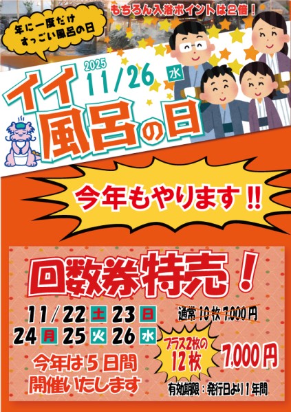 大蔵海岸通にある「天然温泉 龍の湯」で2025年11月22日(土)~26日(水)に「イイ風呂の日」にちなんだお得な回数券特売が実施されます!